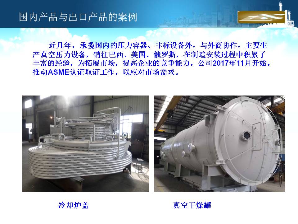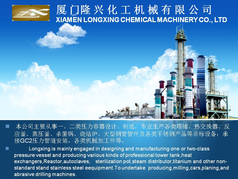 廈門隆興化工機(jī)械有限公司成立于2001年5月,占地面積30000平方米,擁有生產(chǎn)車間面積10000平方米及相關(guān)配套的辦公場所3000平方米,其中下料場所1000平方米,不銹鋼制作場所2000平方米,ASME產(chǎn)品制作區(qū)域1200平方米,無損曝光室30平方米。公司有職工135人,擁有專業(yè)的技術(shù)人員和管理人員36人。公司主要從事設(shè)計、制造A2級覆蓋D類壓力容器...